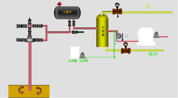 原油脫硫一般采取直接注入原油中, 在三相分離器后加藥,設備需要一臺注入泵和一個分散器或霧化器裝在管道中央。上游的注入點和下游的接受器之間要有足夠的距離,以確保有充足的反應時間,處理后原油逸出H2S的指標低于10PPm以下。生成產(chǎn)物一般為多硫化合物鹽,性能穩(wěn)定,經(jīng)過聯(lián)合站破乳脫水后,隨污水排出。工藝流程如圖下: